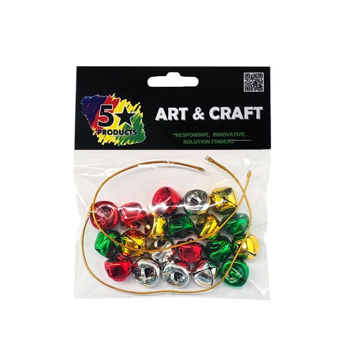 A pack of 20 craft bells with gold string in assorted classic Christmas colours. Red, Green, Gold and Silver.