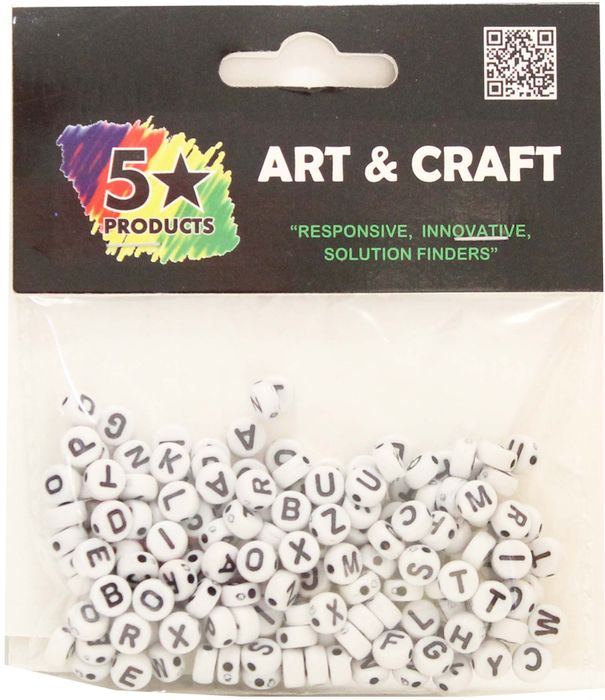 White beads with black alphabet. Pack contains approx.180pcs.