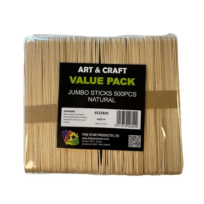 A pack of natural jumbo popsicle sticks. Pack contains 500 sticks. Each Popsicle stick is 19mm x 150mm x 2mm. Great for all ages to use in a variety of Art projects in and around the home, office or class room.