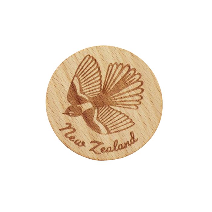 A wooden NZ fantail magnet. Size: 50mm dia x 4mm thickness - made from beech wood
